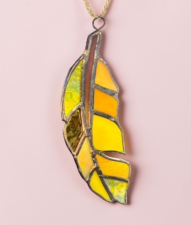 Delicate yet striking, this handmade stained glass feather suncatcher brings lightness and elegance into your home. Each feather is crafted from carefully chosen glass pieces — with a mix of transparent, opaque and iridescent tones — hand-cut, foiled, soldered and treated with black patina.• Size: 4cm wide x 14cm high • Finish: Black patina • Use: Hanging window suncatcher • Materials: Stained glass, lead/tin solder, copper foil and fishing wire hanger.*Please note, due to pieces being one of a kind, individual items sold may vary slightly in colour from product image.*Please also note we re-cycle and re-use packaging wherever possible to reduce our environmental impact.⚠️ Lead Safety Notice This stained glass item is handcrafted using traditional lead/tin solder. Whilst safe to enjoy as a decorative piece, it should be handled with care: Please wash your hands after handling. Do not place in food preparation areas. Keep out of reach of children and pets. For indoor decorative use only. Handle with Love! Our stained glass creations are delicate and breakable — treat them gently so they can shine in your home for years to come. Keep out of reach of little hands and pets.